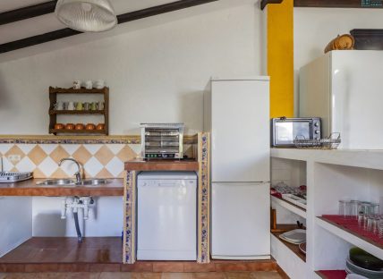 La cocina con menaje completo, dos placas de 4 fuegos cada una, frigorífico-congelador, microondas, televisión en el salón y lavadora